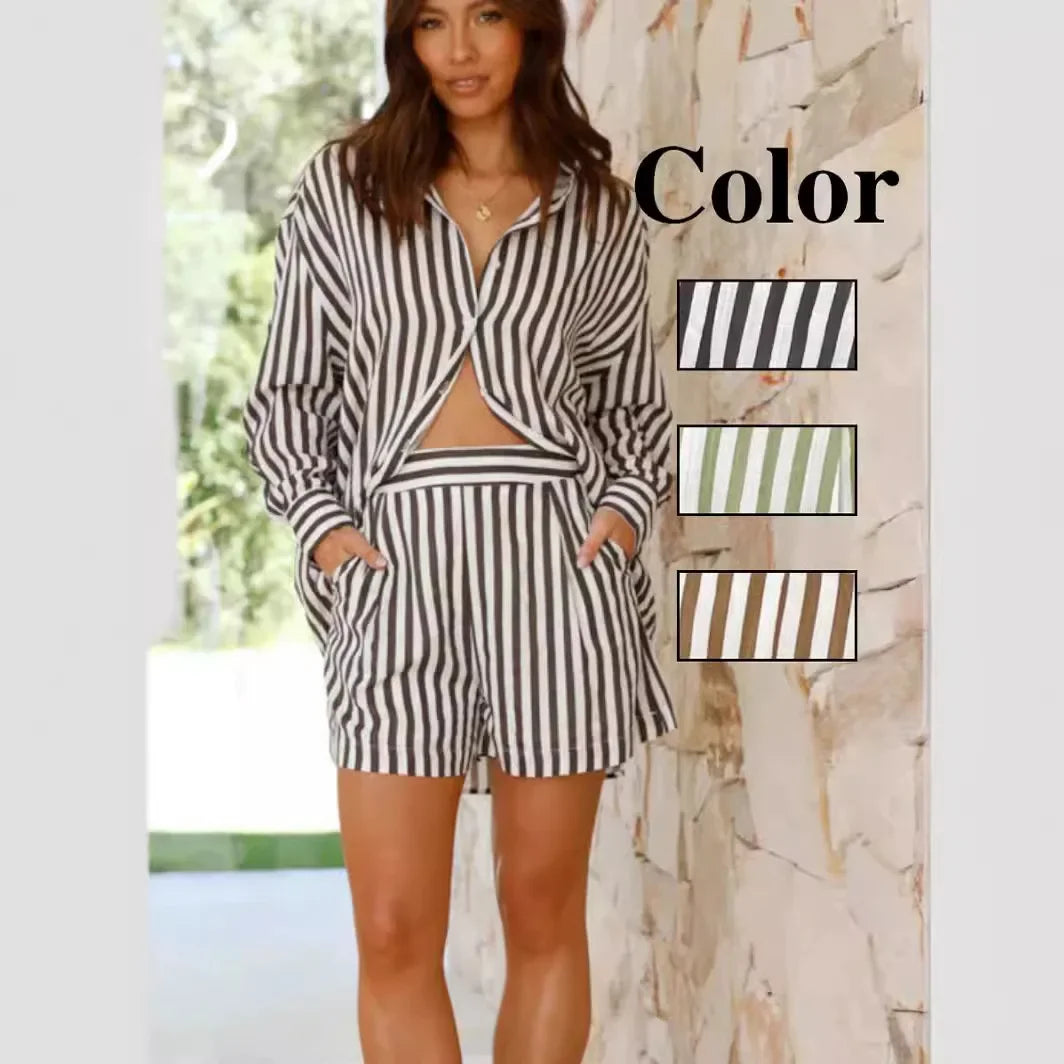 The perfect look for your summer days! ☀️ Our striped two-piece set in navy, black, aqua, or brown and white is ideal for a casual yet chic style. Pair it with your favorite top and sandals for a cool and comfortable outfit.