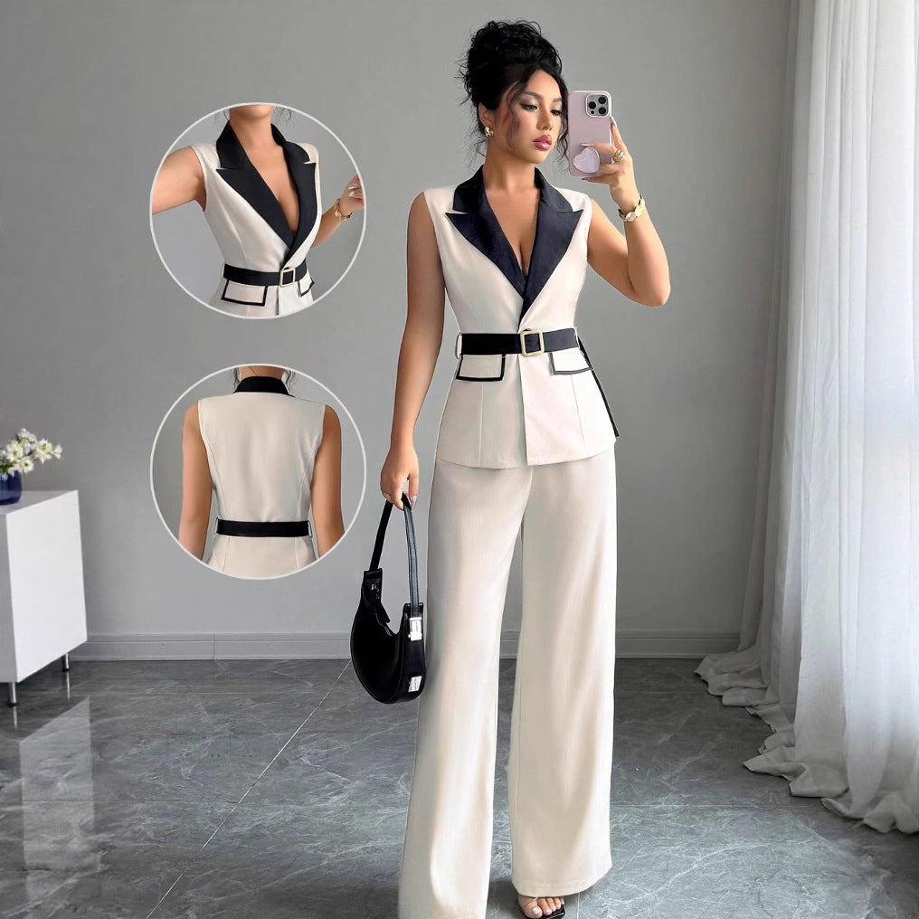 "Unleash your inner boss with this must-have Power Suit Co-ord. Designed for the modern woman on the go, this set combines a sleeveless vest-blazer with a chic belt detail and flowy wide-leg pants. The contrast black lapel adds a touch of drama, making it a versatile piece for both professional settings and stylish outings. Dress it up with heels or down with flats—this set is a true wardrobe essential."