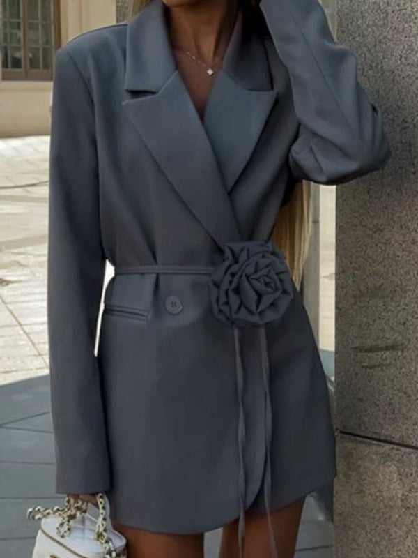 Detalle Escultórico: La flor tridimensional en el mismo tejido aporta un relieve que rompe la monotonía de la sastrería tradicional. Es alta costura aplicada al entorno de negocios.