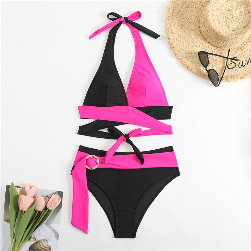 Euro America 2025 New Split Swimsuit Women's Cross Border Color-Blocking, Sexy Deep V Lace-up Color Bikini Amazon