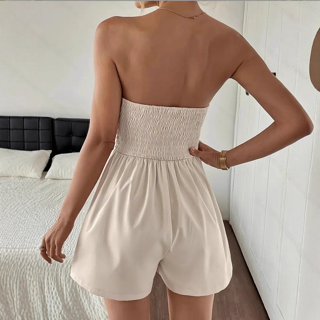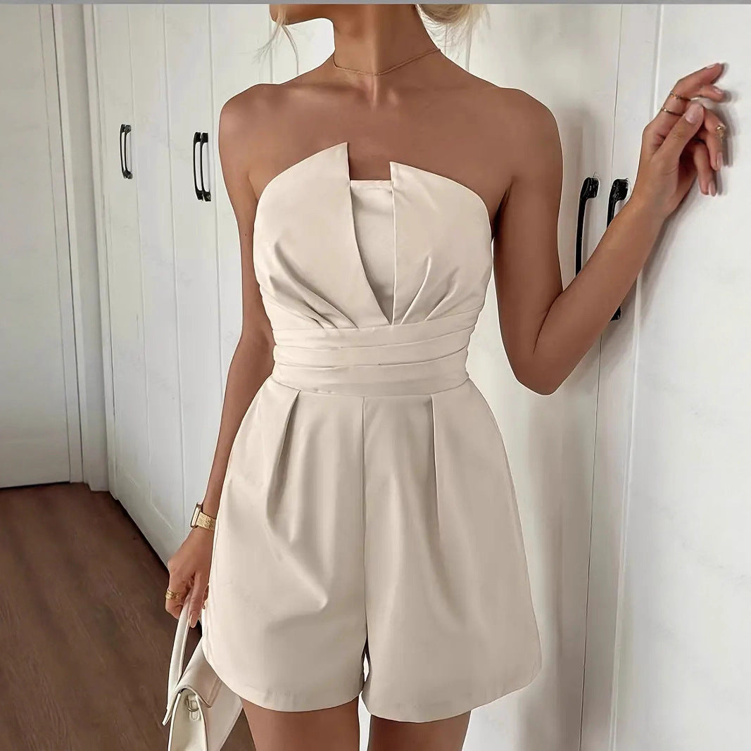 Elevate your wardrobe with the Chic Pleated Strapless Romper. This stunning one-piece features a beautifully crafted bodice with a V-cutout detail, offering a modern twist on a classic style. The structured, high-waist design with subtle pleating creates a flattering A-line shape, ensuring a comfortable yet stylish fit. Made from a high-quality, lightweight fabric, this romper is a must-have for warm weather and is effortlessly sophisticated for any occasion.