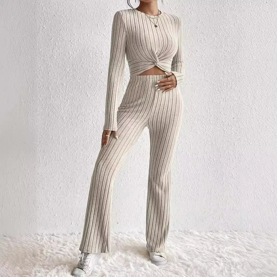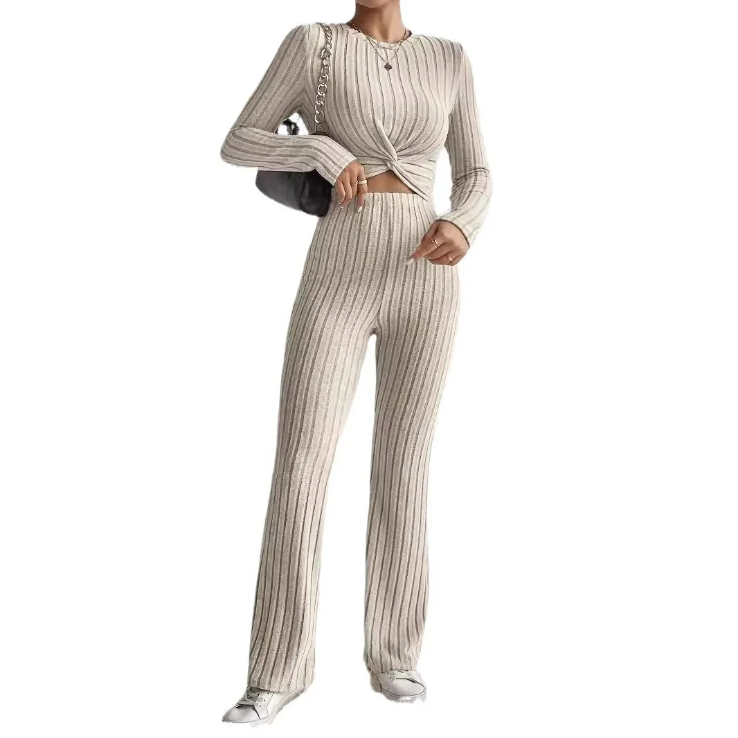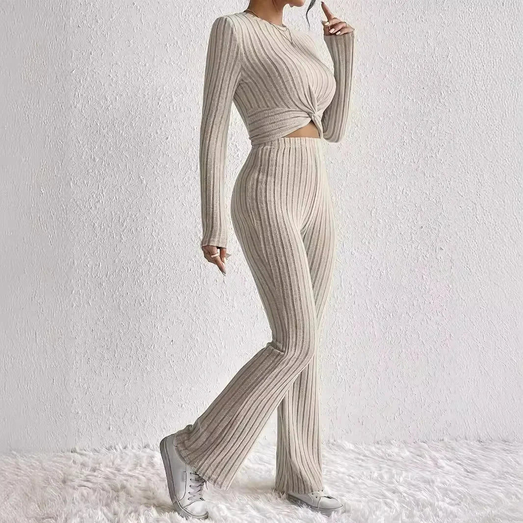 New Casual Solid Color 2-Piece Suit Top And Pants Cropped Long Sleeve Wrap Around Fashion Outfits For Women